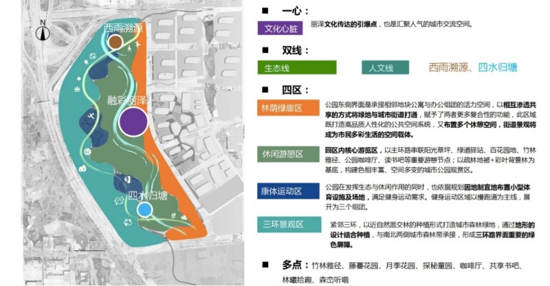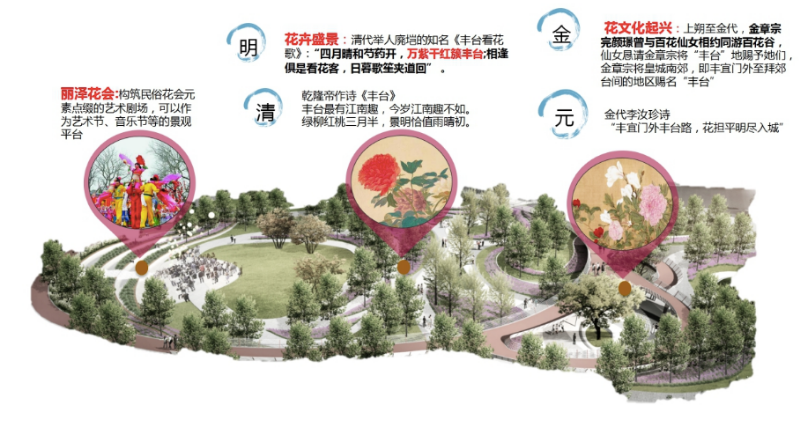 “一心”位于公园中部,是“双线”的汇聚点,以“融彩丽泽”为设计主题,是汇聚人气的交流空间,是公园的文化心脏。据悉,丰台区丽泽周边曾有“丰台十八村”的花卉种植胜景,商务区内东管头、西管头、三路居、万泉寺等村庄的花会表演具有悠久的历史,技艺不凡,“一心”将以丰花台、艺术剧场、百花岛、花阶、并蒂廊等多种景观手段展现丰台独特的花文化,“双线”为生态线和人文线,是公园“花开并蒂,多彩丽泽”设计理念的落地。双线贯穿在各个分区和节点,是全园的纽带和灵魂。