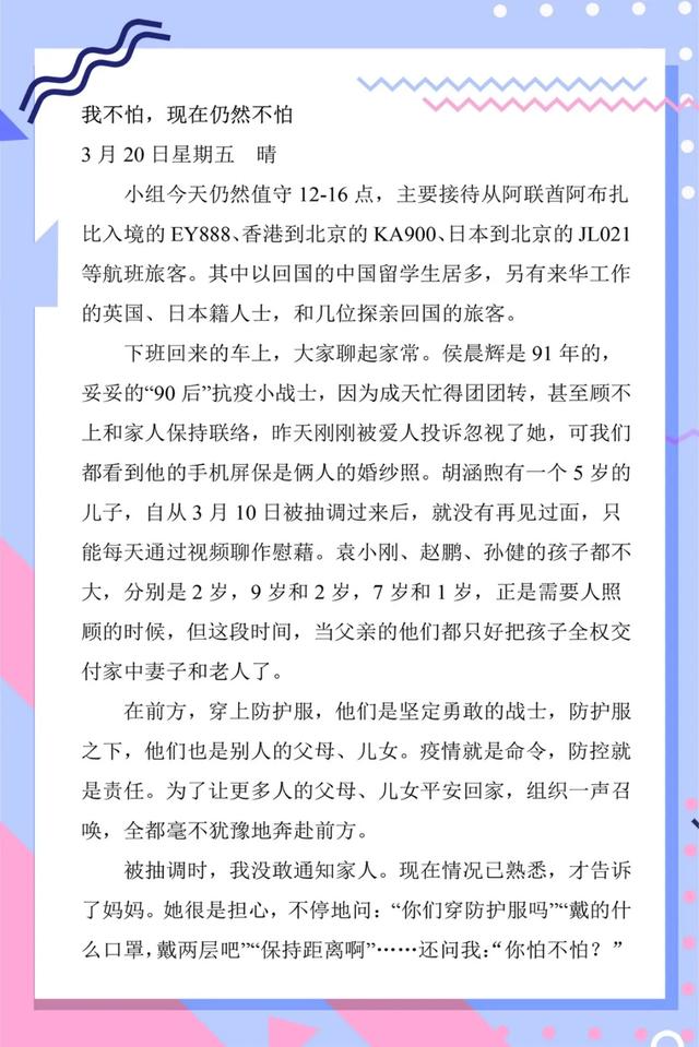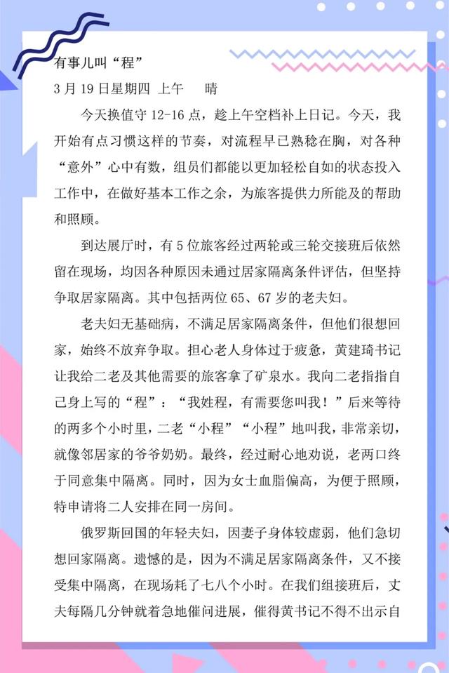 “每一项数据的背后,我们都要反复确认数据的准确全面,说服应隔离人员配合执行隔离政策,掌握办理进度,疏导旅客疲劳焦虑……这一切,关系到一个人长途旅行后的情绪精神,关系到他能否健康回家,关系到一个家庭的牵挂。这一切,是对工作人员体力和精神的双重考验,每个环节都容不得半点马虎和忽视。”程禹嘉这样写道。