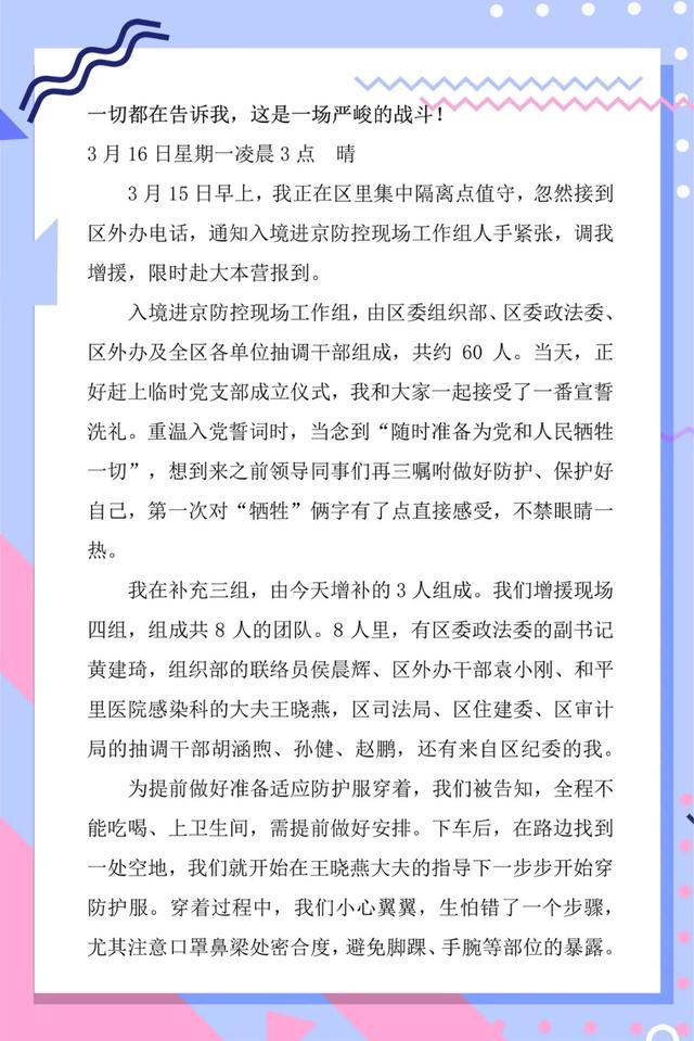 嘈杂的环境、陡增的人流、各不相同的入境情况……3月15日是程禹嘉正式作为专班现场工作组第四组一员的第一天,与其他7名组员组成8人团队,其他人分别是区委政法委副书记黄建琦、区委组织部联络员侯晨辉、区外办干部袁小刚、和平里医院感染科大夫王晓燕,以及从区司法局、区住建委、区审计局的抽调干部胡涵煦、孙健、赵鹏。