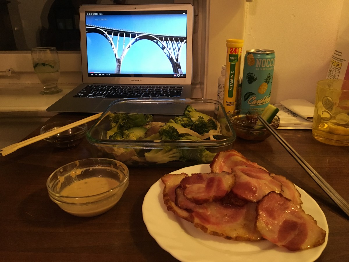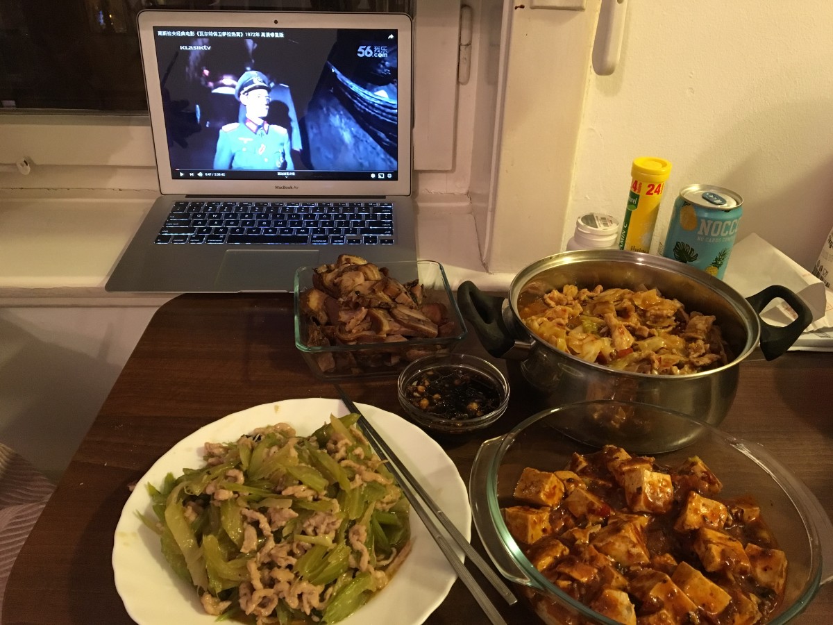 桂祎明和女朋友在看《瓦尔特保卫萨拉热窝》,面前的麻婆豆腐、酱肘子、芹菜肉丝、水煮肉片,都是从中餐馆点的外卖。