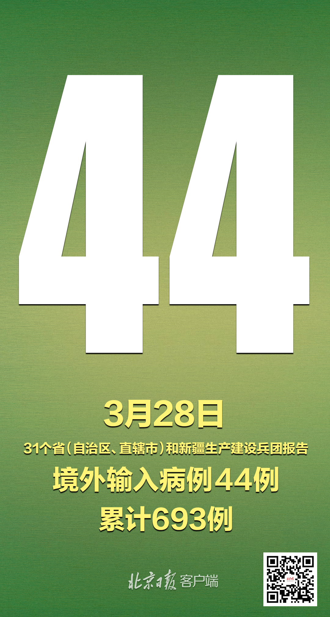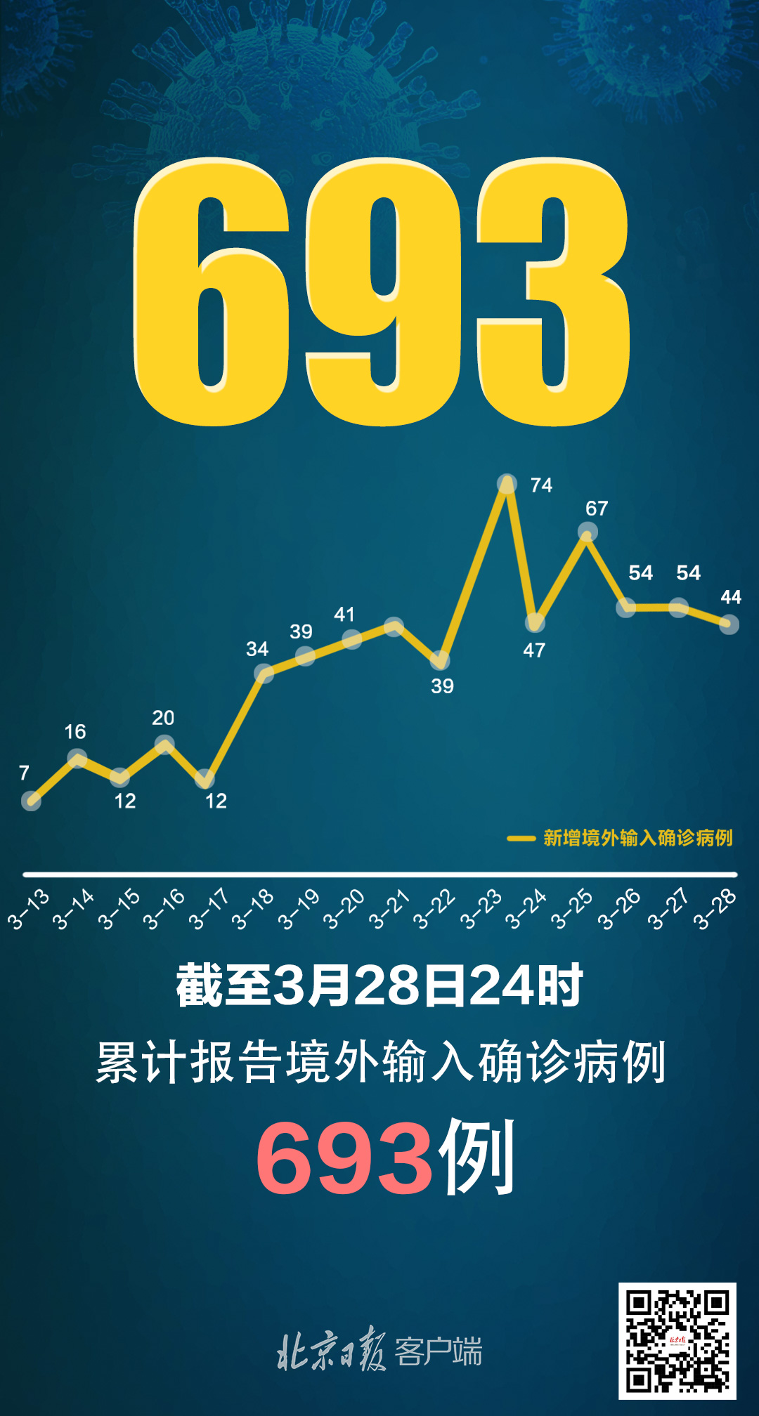 3月28日0—24时,新增报告境外输入确诊病例44例(广东8例,天津7例,上海7例,北京4例,辽宁3例,江苏3例,浙江3例,四川2例,山西1例,内蒙古1例,吉林1例,福建1例,江西1例,重庆1例,贵州1例)。截至3月28日24时,累计报告境外输入确诊病例693例。