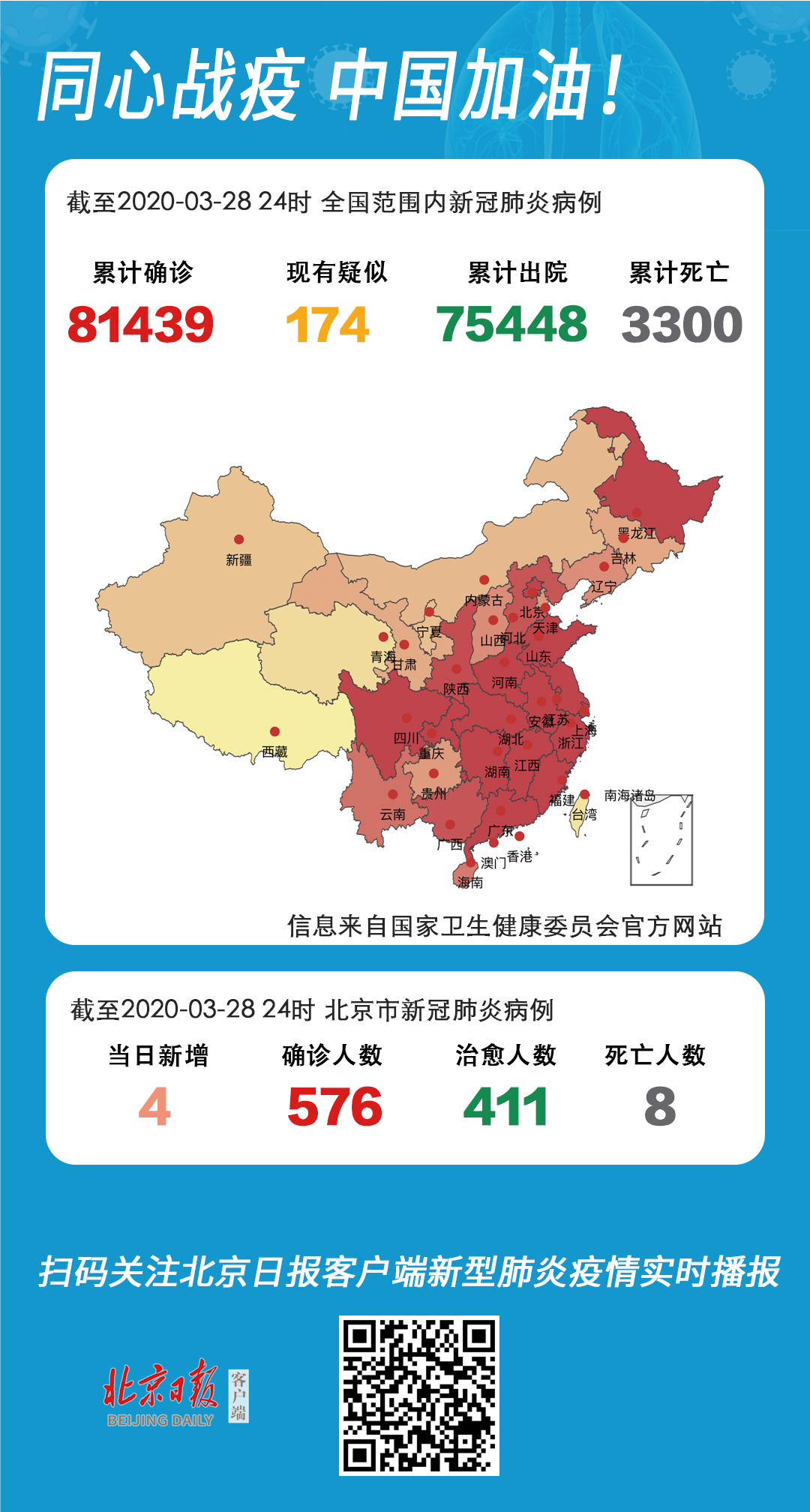 截至3月28日24时,据31个省(自治区、直辖市)和新疆生产建设兵团报告,现有确诊病例2691例(其中重症病例742例),累计治愈出院病例75448例,累计死亡病例3300例,累计报告确诊病例81439例,现有疑似病例174例。累计追踪到密切接触者701884人,尚在医学观察的密切接触者18581人。