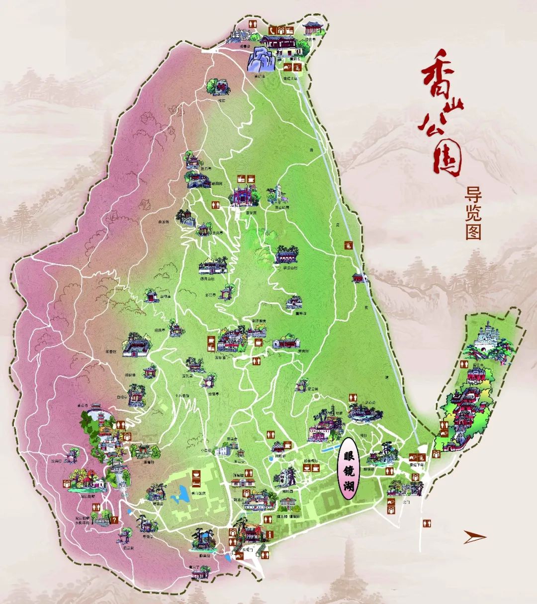 眼镜湖位于香山公园北门附近。历史上由两潭水构成,民国时期湖水被一座白石拱桥一分为二,自远望去犹如一副闪光发亮的眼镜,故有眼镜河之称,1959年对眼镜河进行疏竣工作,之后改称眼镜湖,湖水引自碧云寺卓锡泉。湖的北面靠山,上有叠石小洞,洞口有瀑布,晃如水帘,所以又称之为小水帘洞。湖的东南侧是“佳日亭”。建于1992年,为十字重檐顶。亭内画有苏式彩画。