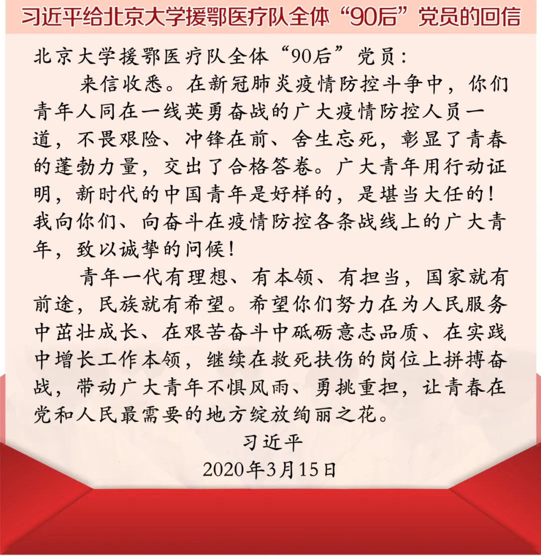 习近平给北京大学援鄂医疗队全体“90后”党员回信,向他们和奋斗在疫情防控各条战线上的广大青年致以诚挚问候。在国际医院援鄂医疗队中,有三名“90后”党员,他们是付雪莹、孙芸和李伟鹏。