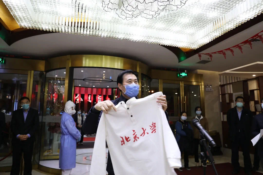 刘玉村叮嘱医疗队员在接下来集中隔离的这段时间里,既要好好休息调整,也不要放弃通过疫情防控工作,观察世界、感悟人生,并向大家赠送了北大的礼物:一件印有北京大学、北大医学字样的纪念服装和两本精心挑选的书籍——《习近平的七年知青岁月》《平凡的世界》。