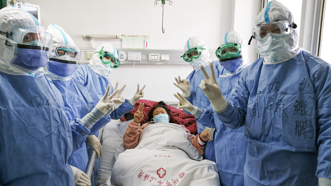 一位59岁的重症患者,经过近20天坚持不懈的救治,病情大为好转顺利转入普通病房,成为国际医院医疗队所在的ICU病房首例转出的新冠肺炎重症患者。在声声祝福中,这位“婆婆”开心地和医疗队员合影。