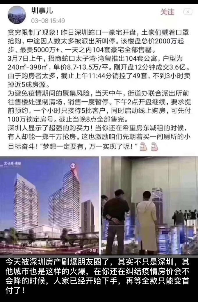 “深圳蛇口豪宅楼盘2000万起,一天之内104套全部售罄……”在新房销售人员张超的朋友圈里,有一张深圳某售楼处排队买房的照片。他还特意补充道:不只是深圳,其他城市也是这样的火爆,你还在纠结疫情房价会不会降的时候,人家已经开始下手,再等全款只能变成首付了!