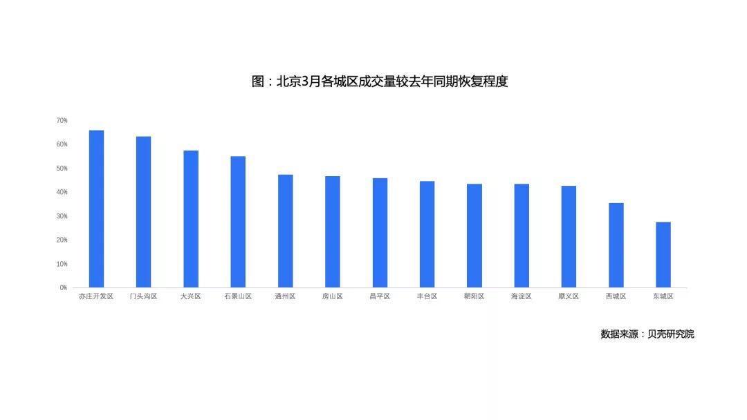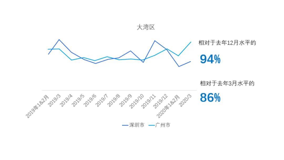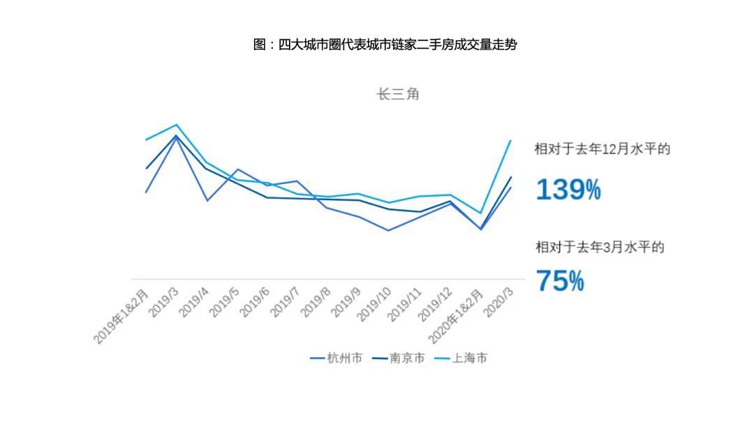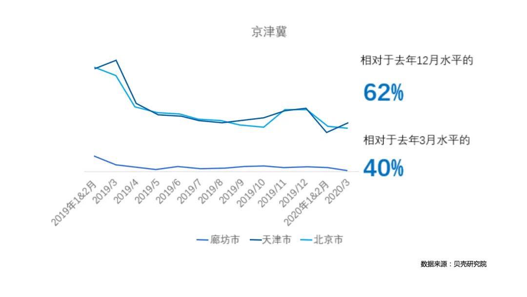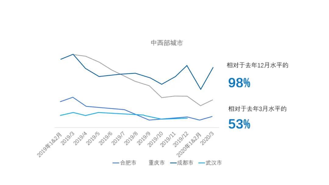 从市场恢复程度来看,上海、南京与杭州三个长三角城市3月成交量已经恢复至去年三月水平的75%;成都、合肥、重庆、广州、深圳接近疫情前的12月水平;为北京、天津、廊坊大约为去年12月水平的62%,相当于去年同期水平的40%。