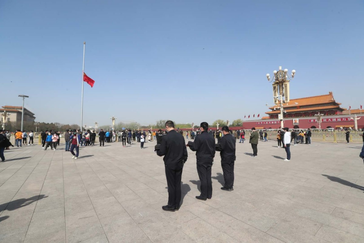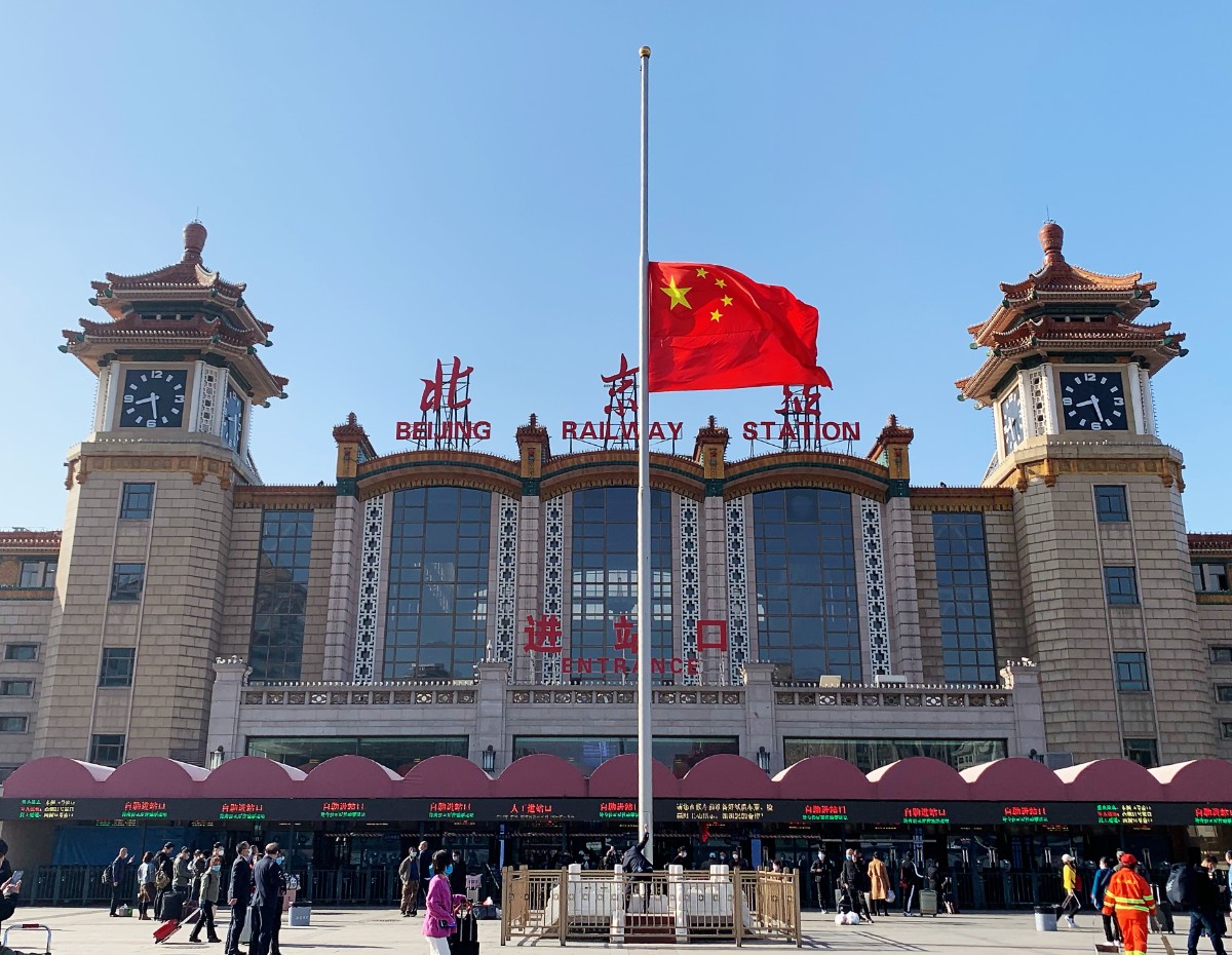 4日8时许,北京站前广场举行下半旗仪式,向因抗击新冠肺炎疫情斗争牺牲的烈士和逝世同胞致哀。