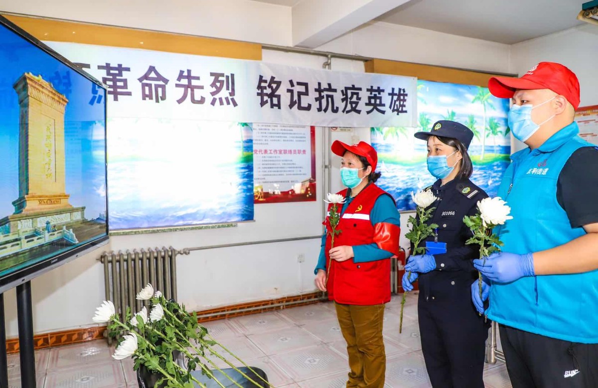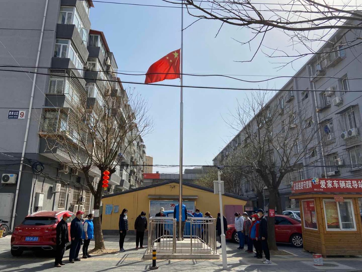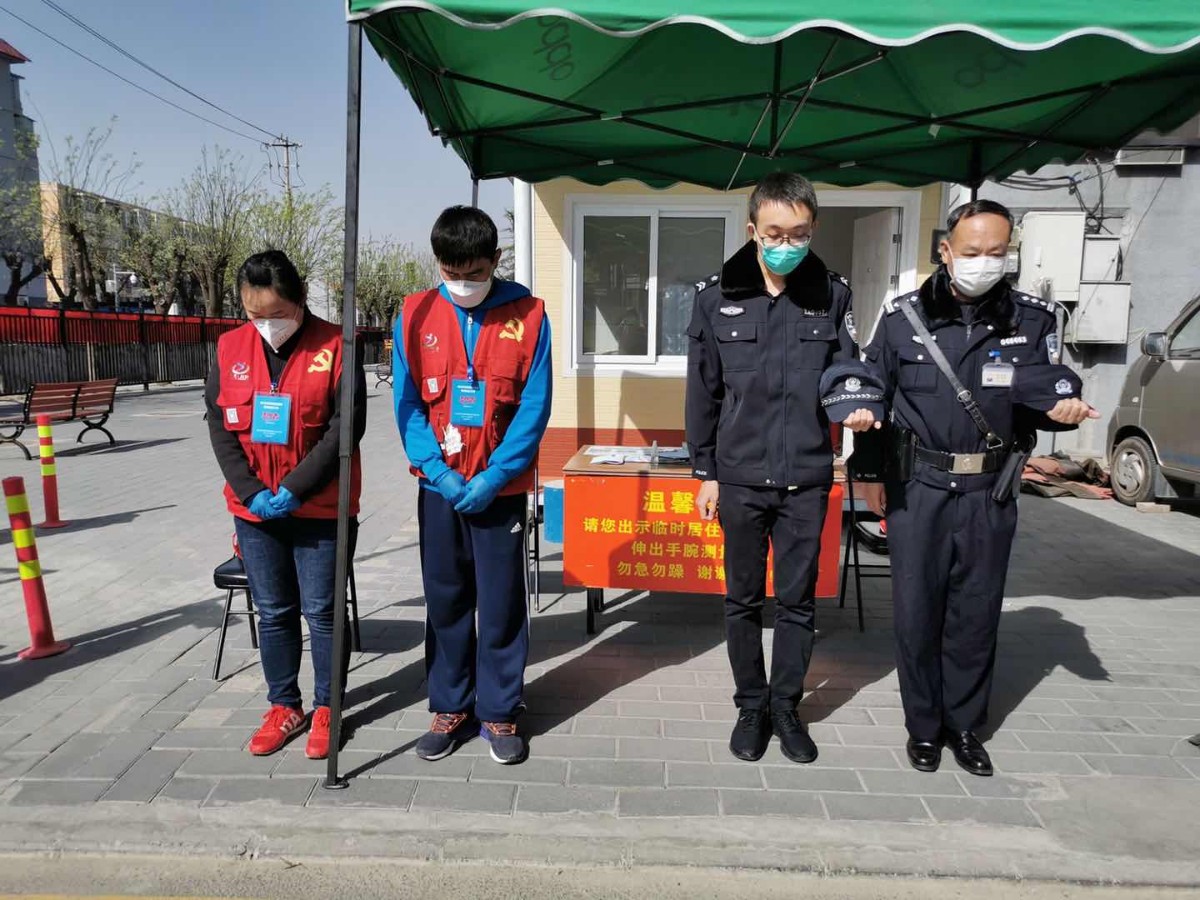 上午十点整,顺义区胜利街道党员干部群众疫情防控志愿者,集体默哀三分钟,向革命先烈,向在疫情防控当中牺牲的医务工作者、社区工作者,以及不幸病逝的同胞致敬。