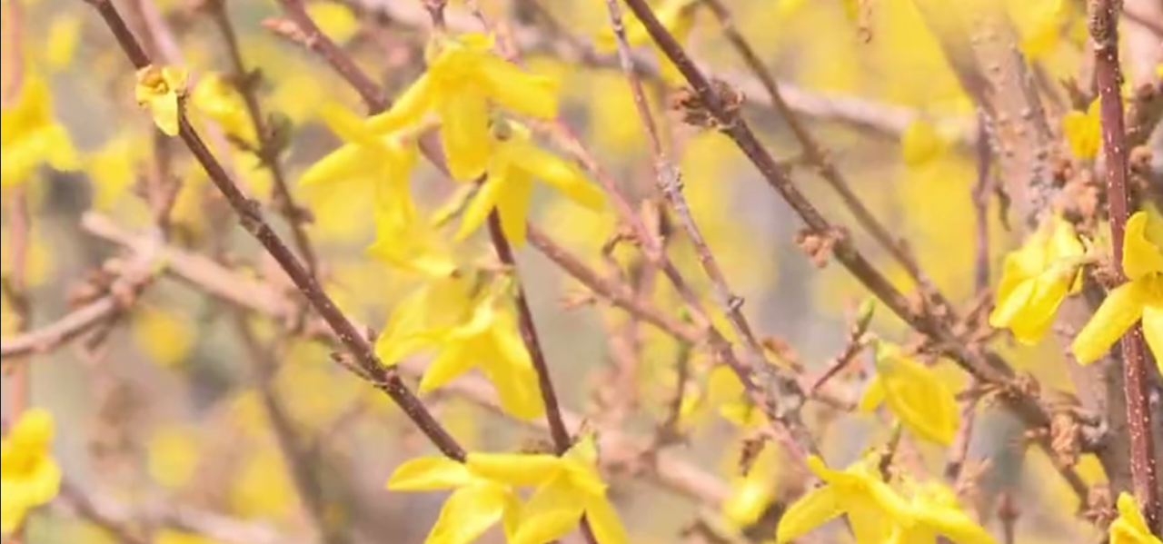 近处的各类树木有的刚刚发芽,有的含苞待放,有的早已是花满枝头。白里透粉的杏花显得格外纯净,整棵树干上都被花朵点染,随风摇曳,站在树下,时不时还会有花瓣落在肩头,沁着一点微微的香气,松散着你一天的劳累。簇簇连翘更是不甘落后,鲜亮的黄色花朵压满枝头,格外耀眼。