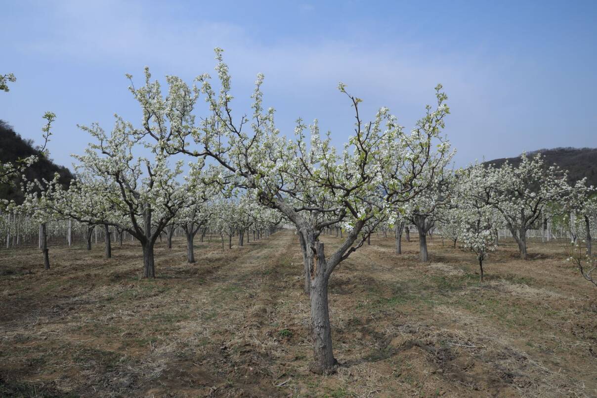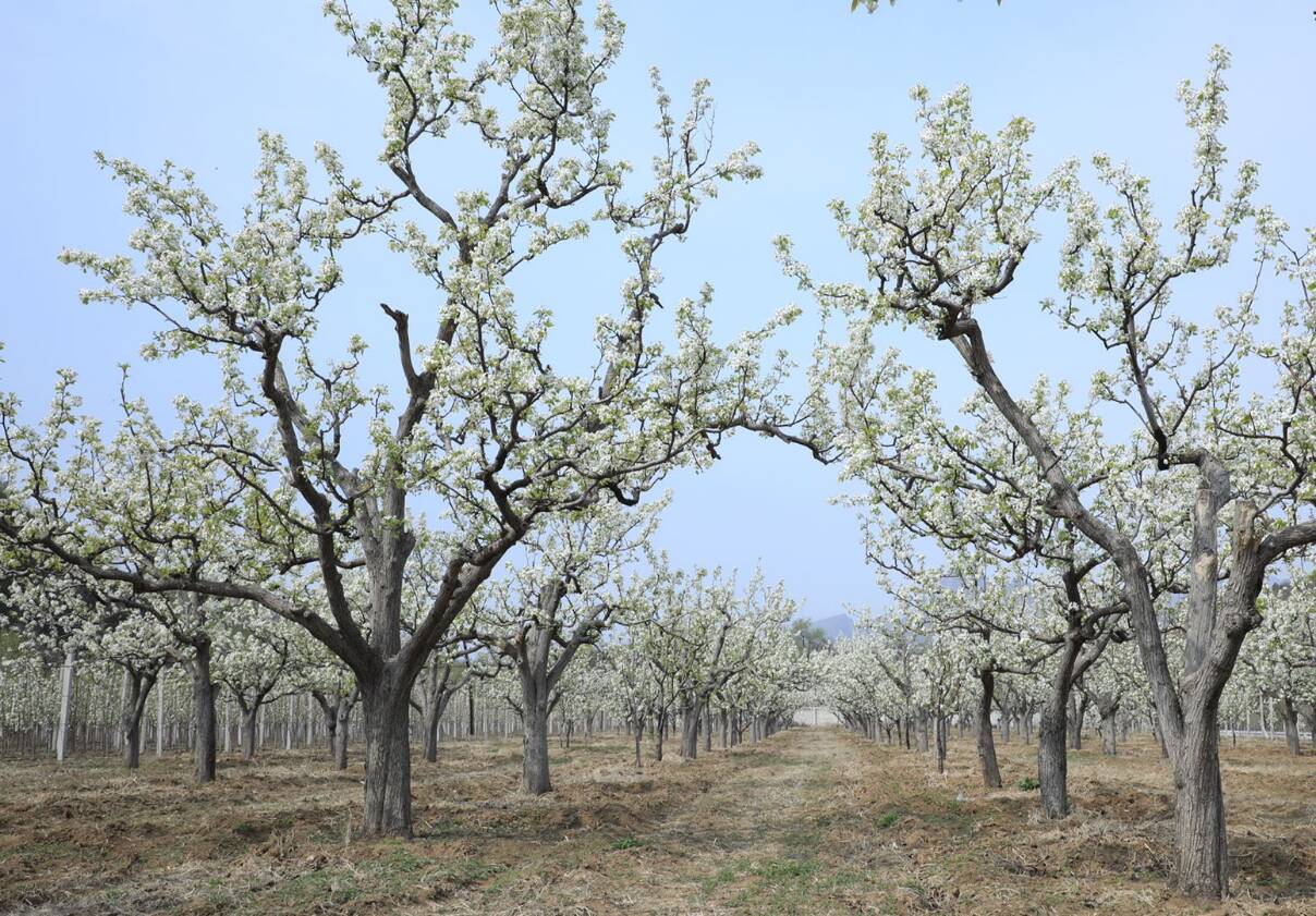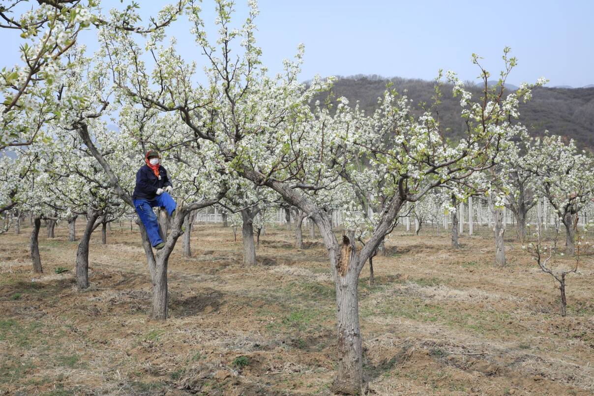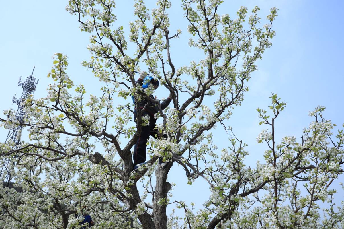 进入盛花期的京白梨,正是授粉的关键时期,果农们登梯爬树仔细为梨花上粉,以期喜获丰收。