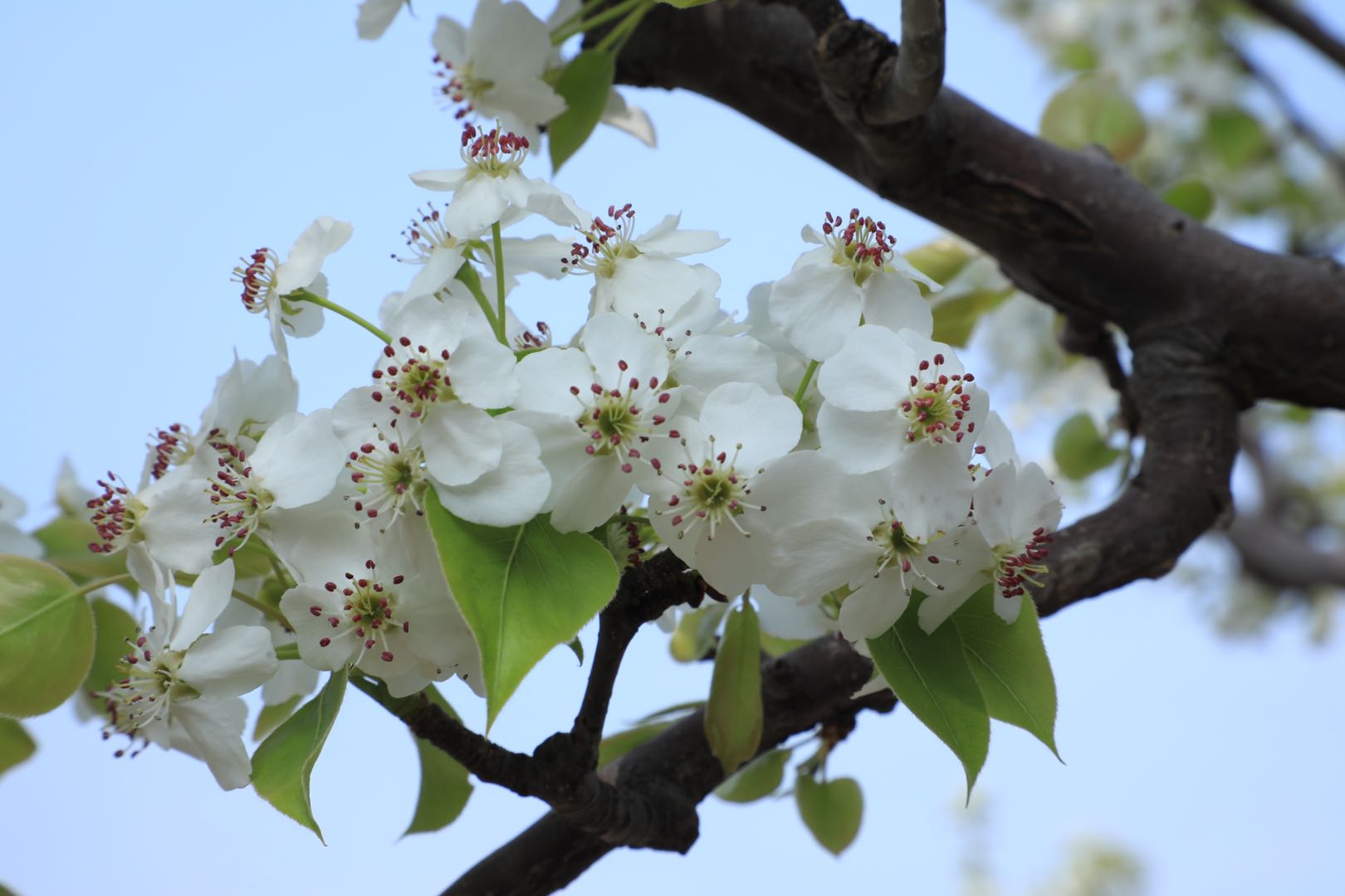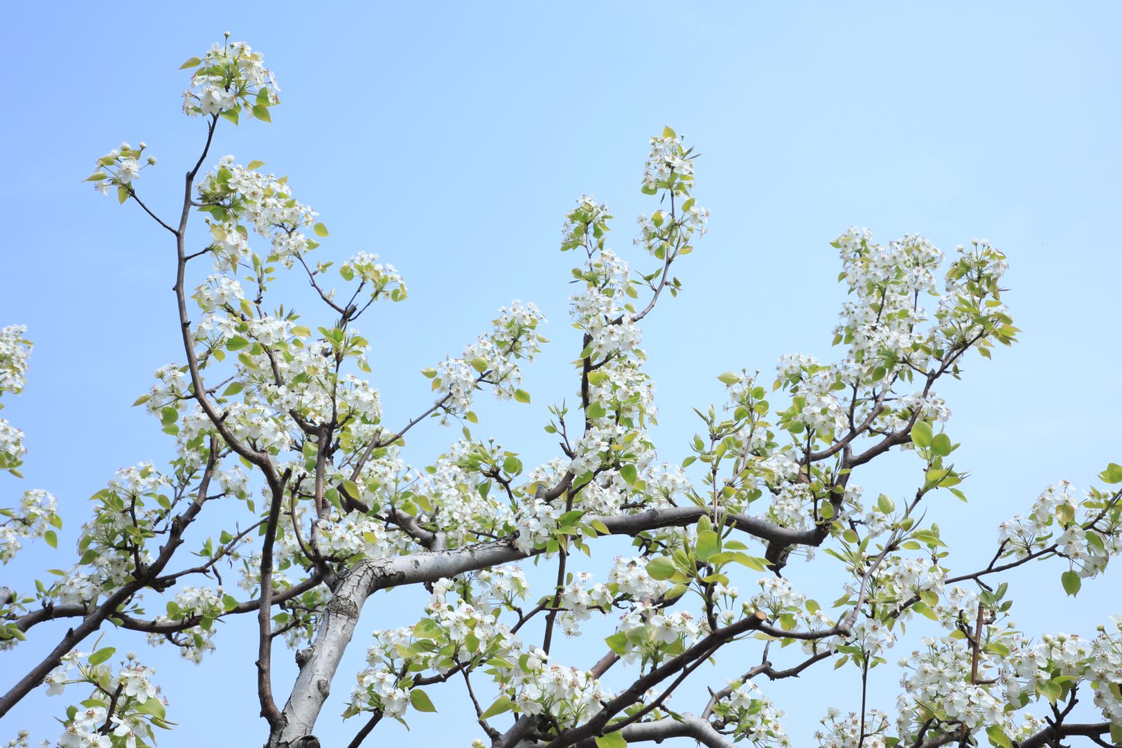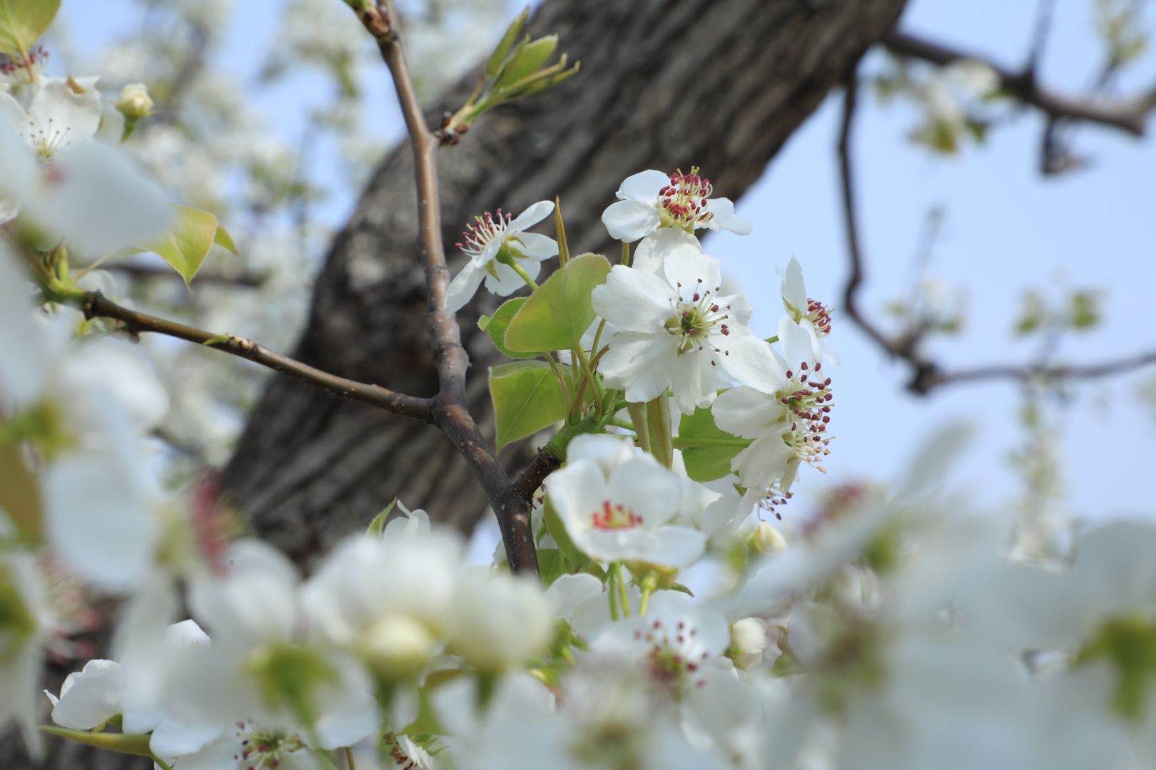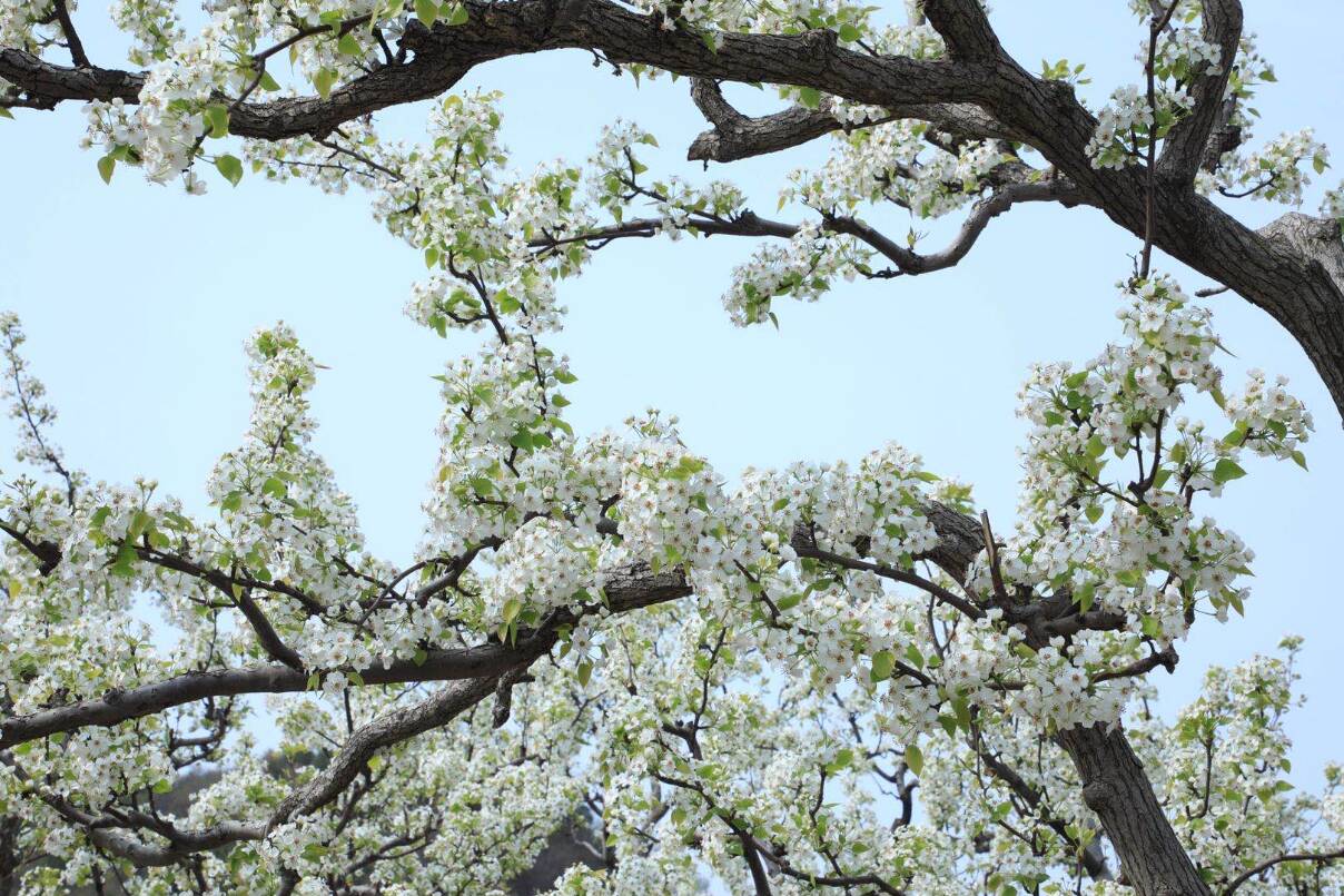 进入盛花期的京白梨,正是授粉的关键时期,果农们登梯爬树仔细为梨花上粉,以期喜获丰收。