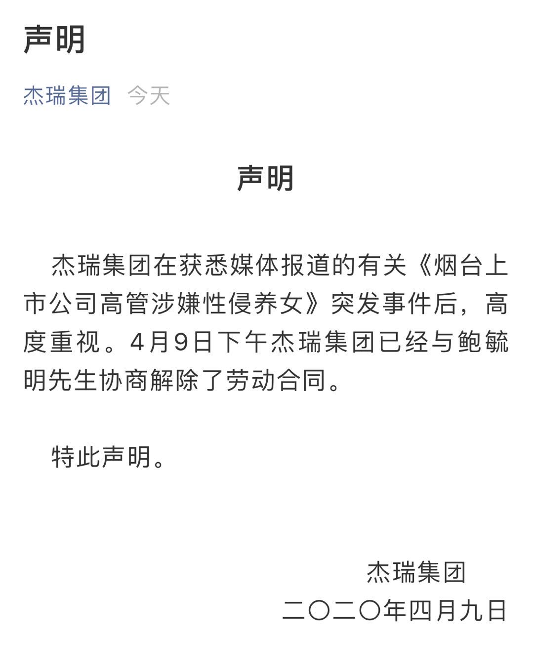 4月9日,杰瑞集团官方微信公众号发布声明,称杰瑞集团在获悉媒体报道的有关《烟台上市公司高管涉嫌性侵养女》突发事件后,高度重视。4月9日下午杰瑞集团已经与鲍毓明先生协商解除了劳动合同。