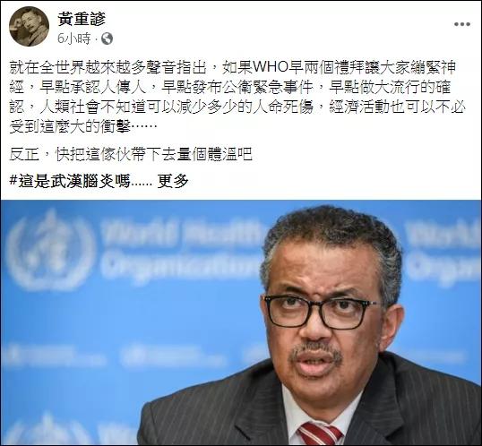当时,黄重谚发文质疑谭德塞和世卫组织领导防疫不利,并嘲讽“快把这家伙带去量个体温吧!”还加入歧视和侮辱性的标签“#这是‘武汉脑炎’吗”。