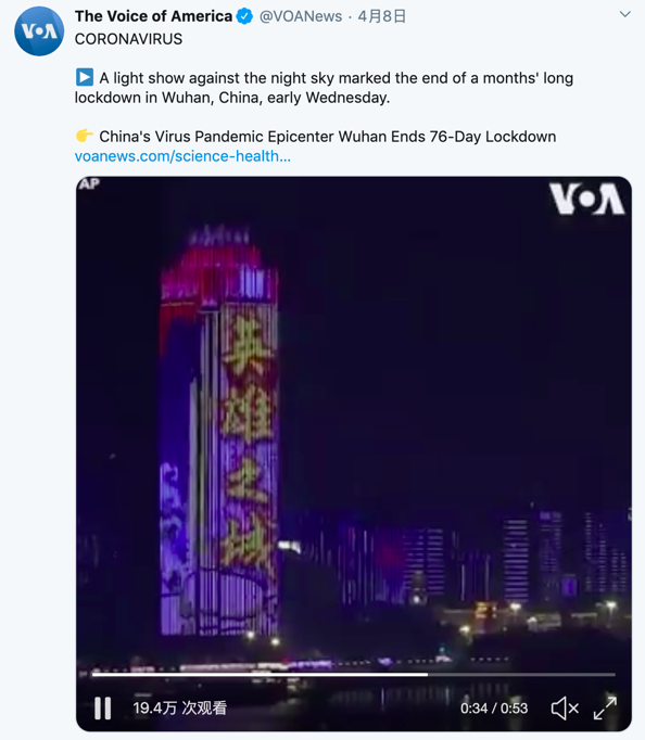 比如,“美国之音”称中国对武汉“封城”是个成功的模式,被世界上许多国家效仿。武汉“解封”之日,“美国之音”还在推特上分享灯光秀视频……