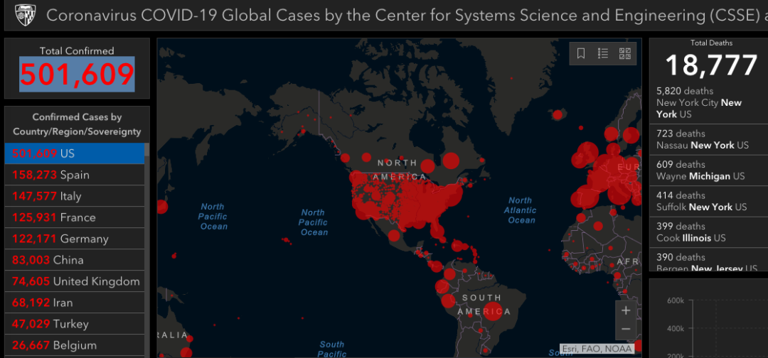 事情没这么简单。其实,早在“美国之音”发布这张令美国政府“扎心”的对比图前,北京时间4月1日上午4点55分,美国约翰斯·霍普金斯大学统计就显示美国新冠肺炎累计确诊184183例,累计死亡3721例,已经超过中国的3305例。