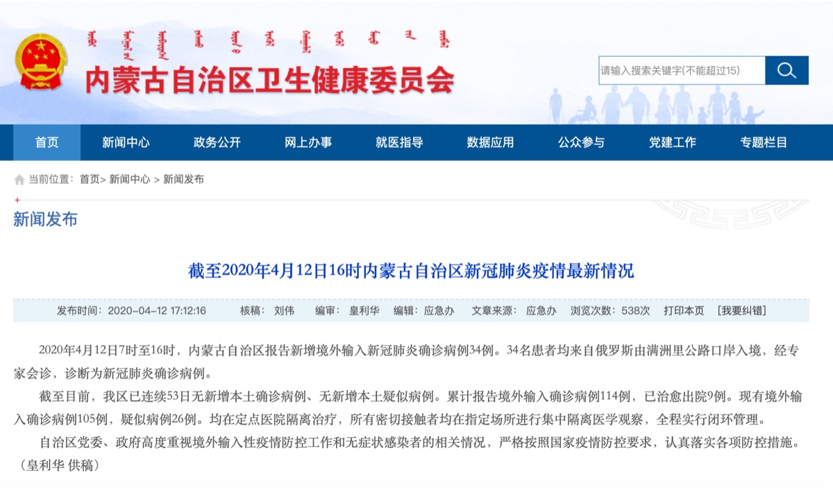 据内蒙古卫健委消息,4月12日7时至16时,内蒙古自治区报告新增境外输入新冠肺炎确诊病例34例。34名患者均来自俄罗斯由满洲里公路口岸入境,经专家会诊,诊断为新冠肺炎确诊病例。