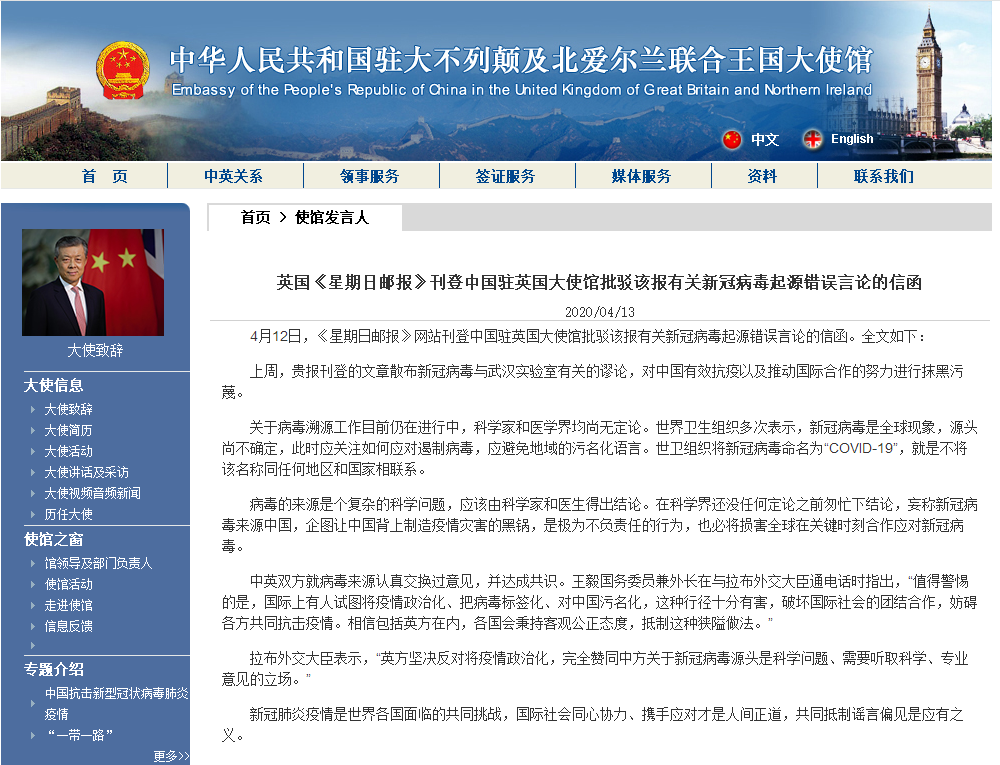 4月12日,《星期日邮报》网站刊登中国驻英国大使馆批驳该报有关新冠病毒起源错误言论的信函。全文如下: