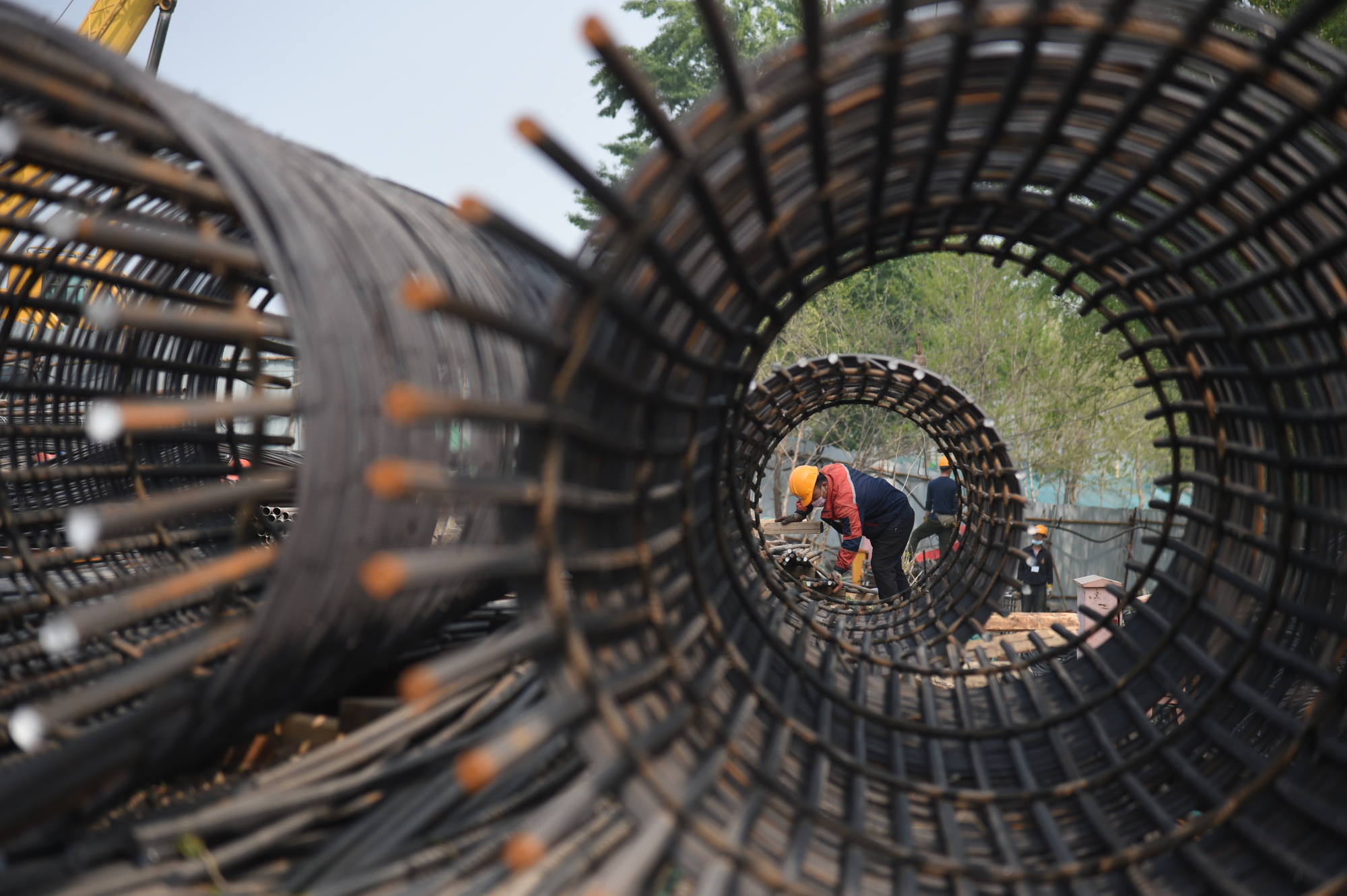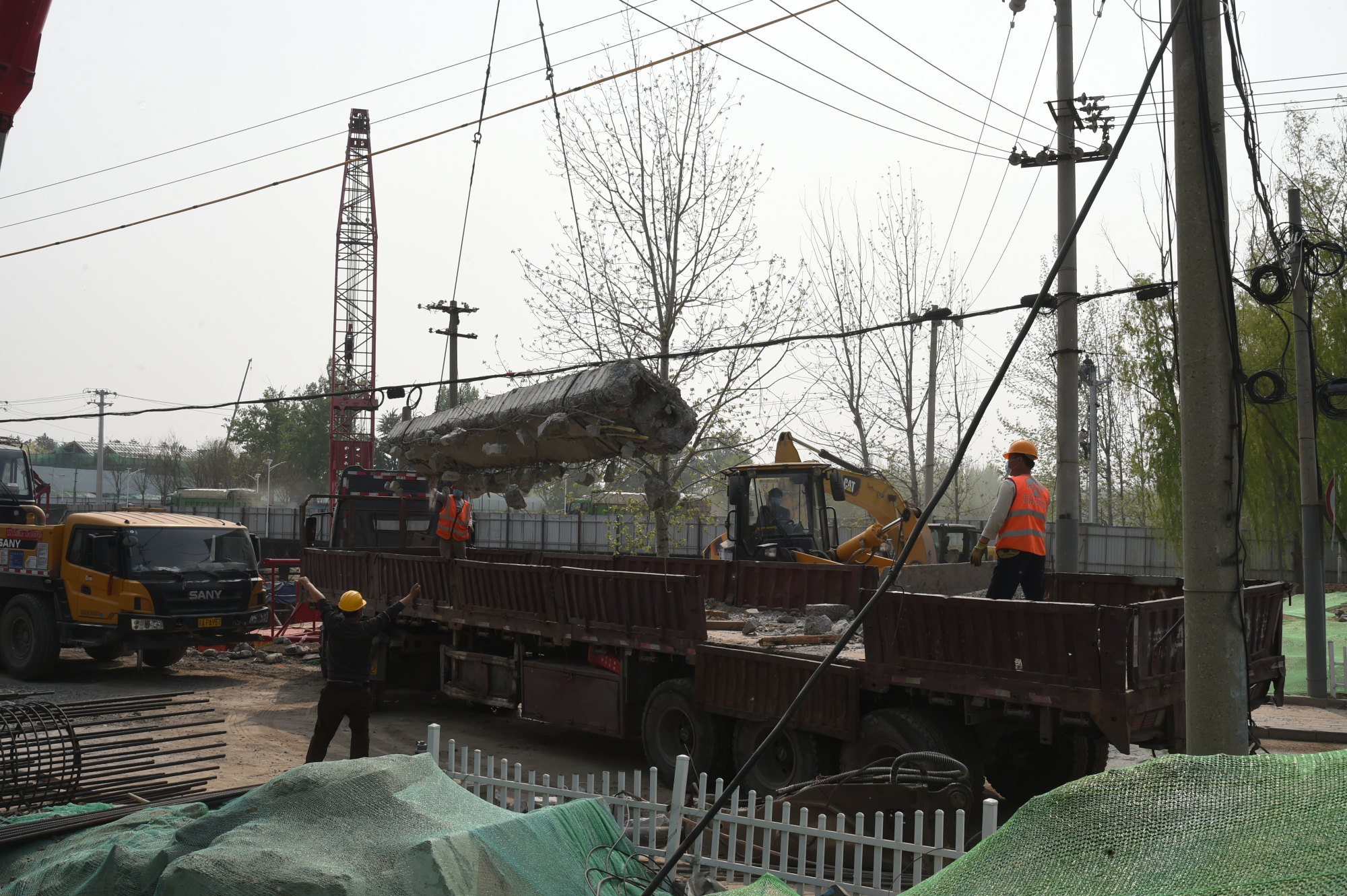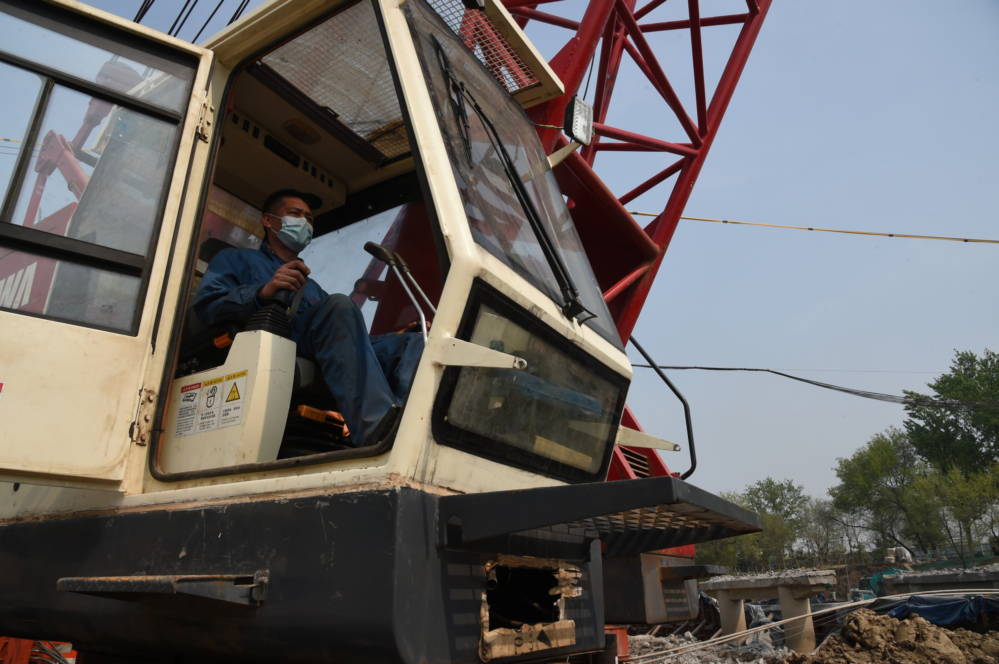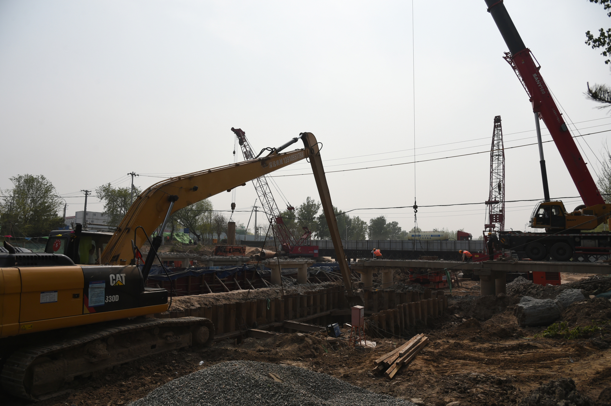 4月14日下午,来广营北路(北段)施工现场,工人们操作着机械正在紧张地施工作业,一派繁忙景象。