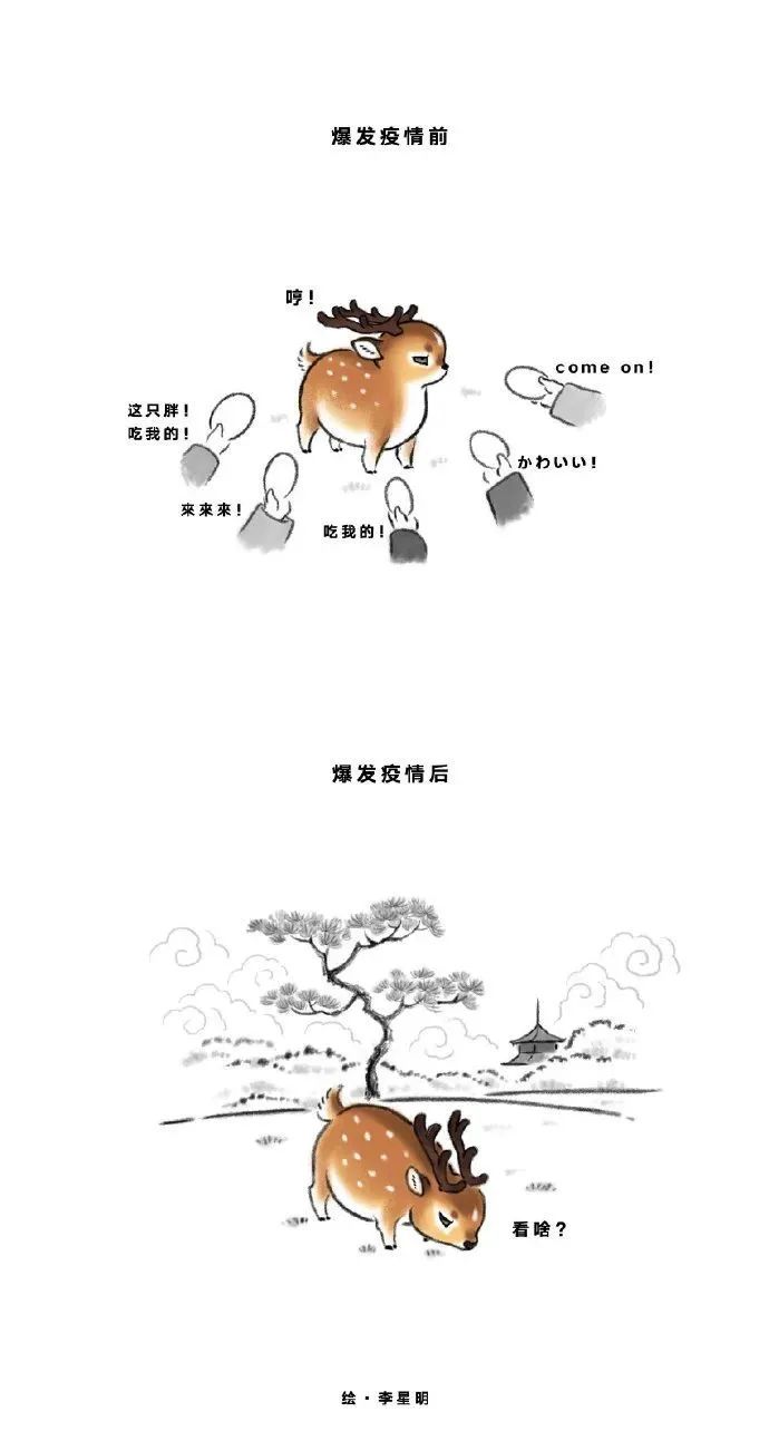 爆发疫情后:奈良小鹿饿得开始吃草。