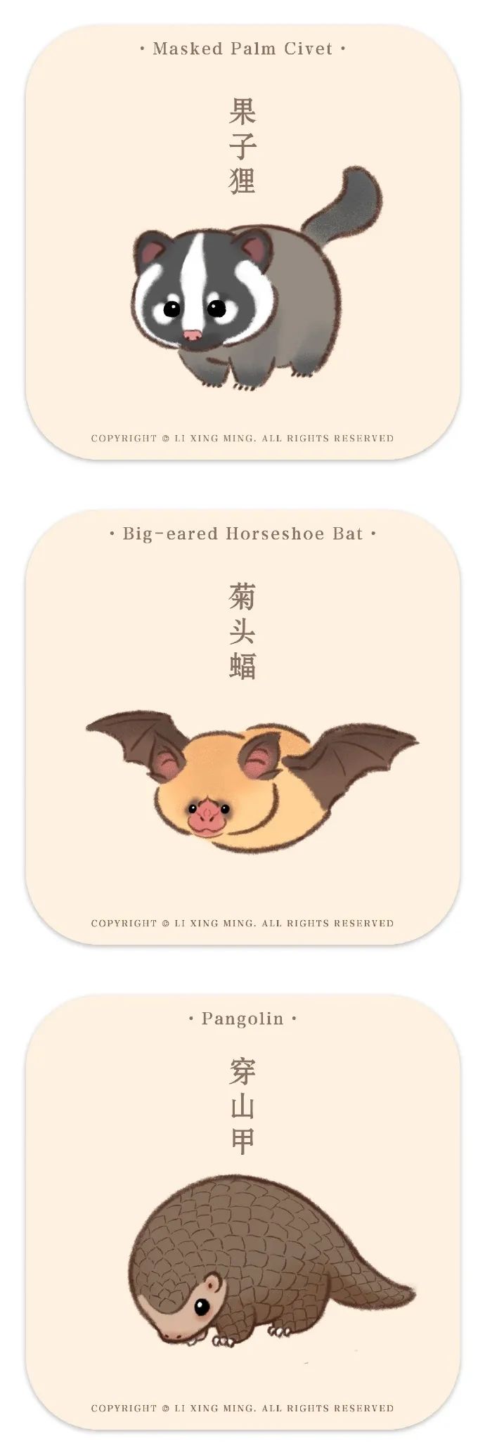 今天画的动物组合是夜(野生)礼(果子狸)服(蝙蝠)假(穿山甲)面——野狸蝠甲面组合!我们是不能吃的哦!