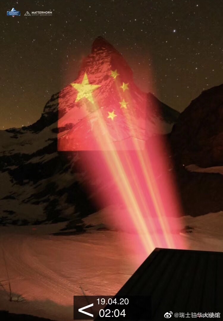 北京日报客户端记者从瑞士驻华使馆获悉,北京时间4月19日上午8点至10点,一面五星红旗被投影在瑞士著名的马特宏峰上。这是马特宏峰所在的采尔马特送给中国的礼物。
