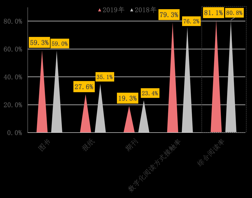 2019年我国成年国民包括书报刊和数字出版物在内的综合阅读率为81.1%,较2018年的80.8%提升了0.3个百分点,数字化阅读方式的接触率为79.3%,较2018年的76.2%上升了3.1个百分点,图书阅读率为59.3%,较2018年的59.0%上升了0.3个百分点。