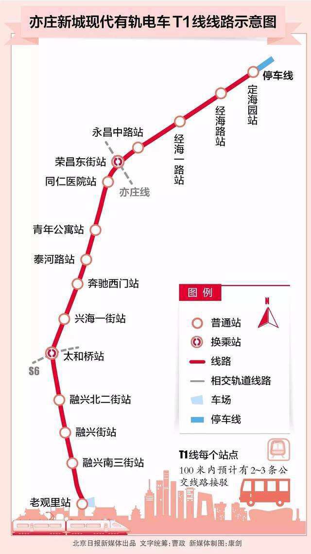 亦庄新城有轨电车T1线线路全长13.25公里,南起老观里,途经瑞合路、博兴路、荣昌东街、科创街,终点设定在定海园,共设15站:分别为定海园站、经海路站、经海一路站、永昌中路站、荣昌东街站、同仁医院站、青年公寓站、泰河路站、奔驰西门站、兴海一街站、太和桥站、融兴北二街站、融兴街站、融兴南三街站、老观里站。其中荣昌东街站可换乘地铁亦庄线,太和桥站可换乘规划中的S6线。