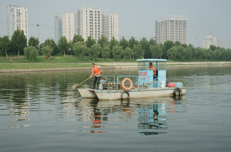 为了保持优美水环境,除了日常保洁工作,北运河管理处近期每日出动水草切割船,对水草进行清除,在重点水域安置拦污索,对水面漂浮物进行分段拦截,提高清洁效率。
