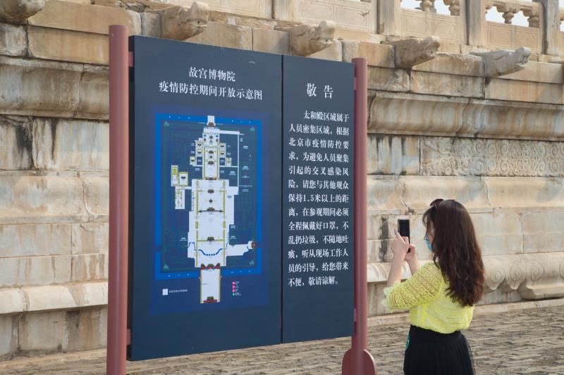 进入开放区域,各种温馨“提示语”的密度明显增加。故宫工作人员在重点区域,以手持广播、指示牌、手举牌等措施,及时提示观众佩戴口罩、避免扎堆。开放前3天,参观现场没有形成观众聚集,参观秩序良好。开放区域的各项服务设施能做到“一客一消毒”。故宫博物院的服务模式得到观众认可。