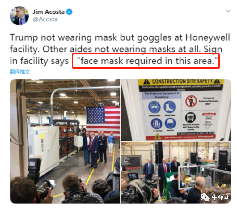 这毕竟不是白宫自己办公室,而是工厂,更有讽刺意味的是,这还是口罩工厂。总统都不戴,这算什么示范效应呢?