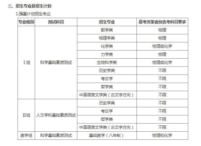 北大将于7月28日至8月4日对入围考生进行考核测试。其中,学科基础素质测试重,对于传统高考省份:Ⅰ组和医学组测试内容为数学、物理、化学,Ⅱ组测试内容为语文、历史、政治;对于高考综合改革省份,Ⅰ组和医学组测试内容为数学、物理,Ⅱ组测试内容为语文、历史。