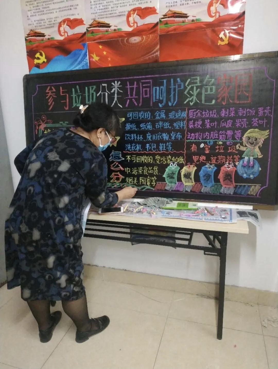 黑板虽小,也是艺术的大舞台。咱们的居民以垃圾分类为主题,将所感、所想描绘出来,进而传播至社区的每一个角落。