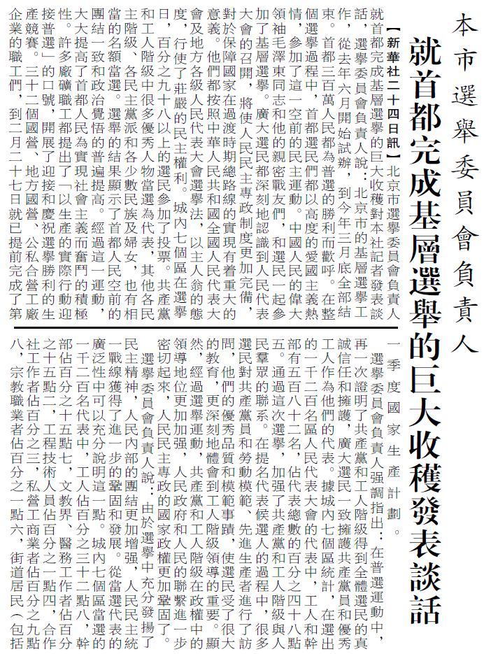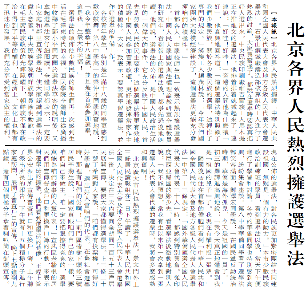 为了全国人民代表大会的召开,各省市都进行了普选。北京各界群众激动地参加了普选。