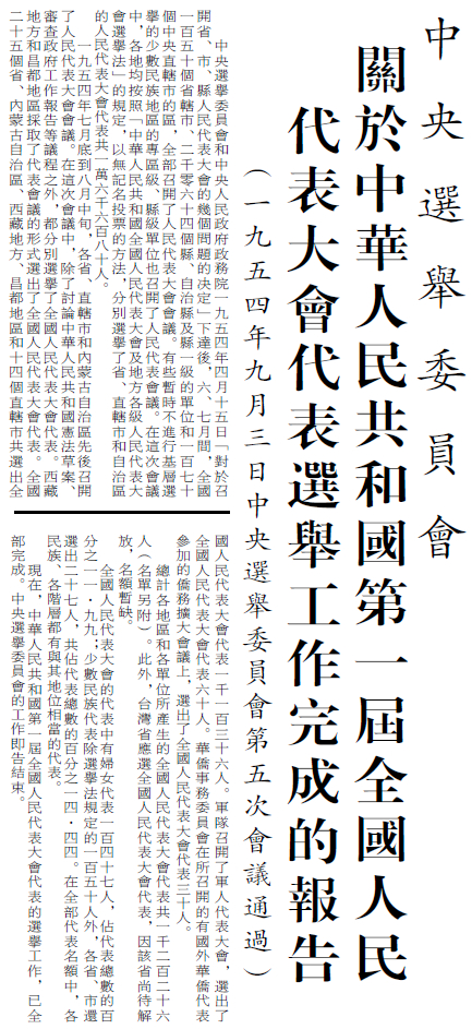 1954年9月3日,中央选举委员会所作报告显示,第一届全国人民代表大会代表的选举工作已全部完成,全国共选出人大代表1226人。(1954年9月4日《北京日报》1版,《关于中华人民共和国第一届全国人民代表大会代表选举工作完成的报告》)