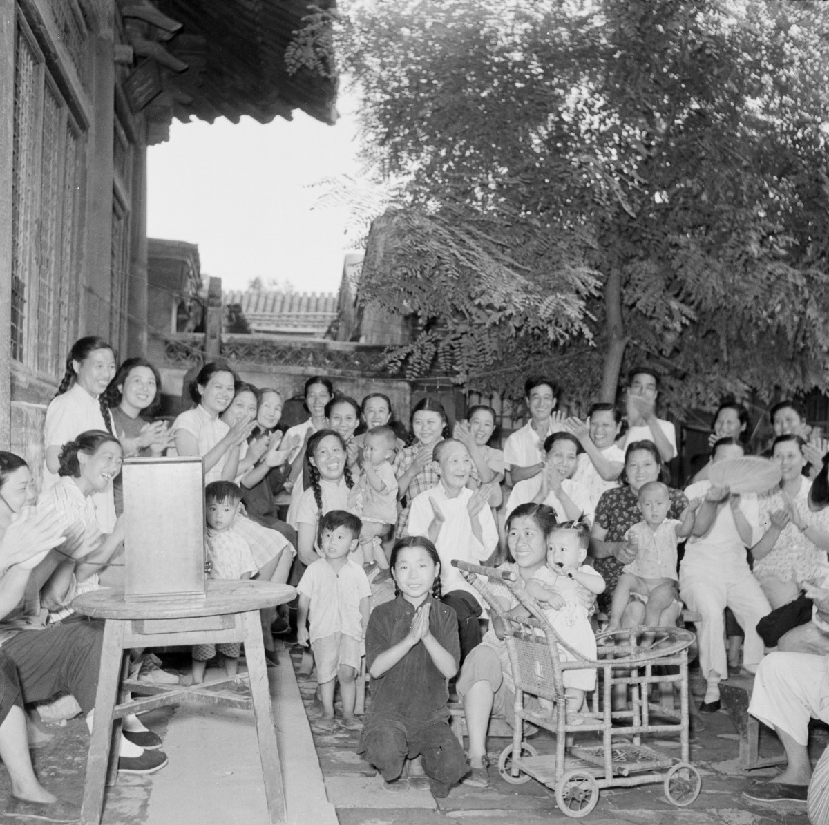 1954年,北京市第一届人民代表大会第一次会议召开期间,东单区西观音寺居民从广播中听到毛主席当选为全国人民代表大会代表时,热烈鼓掌欢呼。江定保/摄