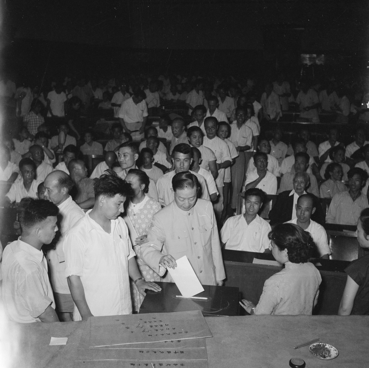 1954年,第一届全国人民代表大会第一次会议上投票通过了《中华人民共和国宪法》,全场欢腾,全体代表起立鼓掌。 邹健东/摄