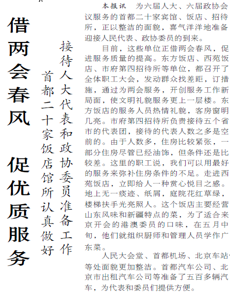 全国“两会”期间,市邮局每天将大会订阅的《人民日报》《北京日报》等7种报纸在早7点以前全部送到代表和委员们下榻的宾馆、饭店。(1995年3月4日《北京日报》4版,《市邮局做好全国“两会”服务准备》)