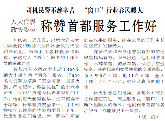 1986年,首汽公司出动了400多辆大小轿车。近500名司机每天很早就把车擦得干干净净,行车坚持安全第一。许多代表和委员还夸奖首都的交通民警指挥有方、服务出色。(1986年4月12日《北京日报》1版,《人大代表政协委员称赞首都服务工作好》)