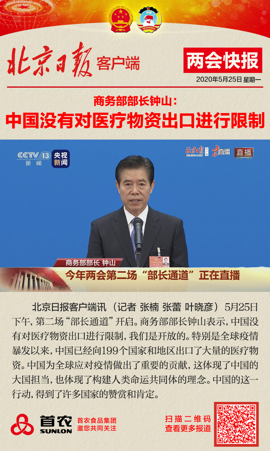 对此,商务部部长钟山回应,中国没有对医疗物资出口进行限制,我们是开放的。特别是全球疫情爆发以来,中国已经向199个国家和地区出口了大量的医疗物资。中国为全球应对疫情做出了重要的贡献,这体现了中国的大国担当,也体现了构建人类命运共同体的理念。中国的这一行动,得到了许多国家的赞赏和肯定。