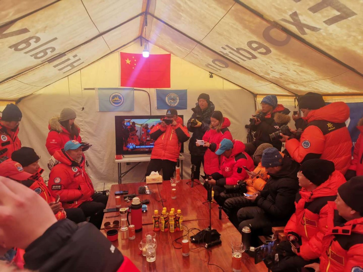 珠峰大本营发布登顶成功的现场。