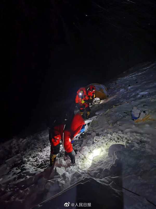 原计划5月26日凌晨3时出发的6名修路队队员起床后发现风太大,向前进营地汇报后,得到延后一小时出发的指令。11时,修路队已抵达海拔8600米,次仁桑珠预计14时前可完成顶峰修路任务。