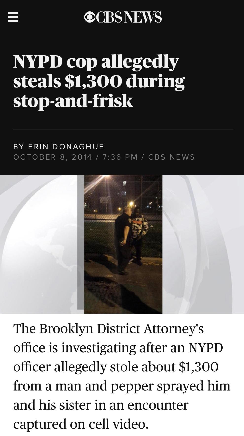 据报道,纽约一位警官曾从被检查者身上偷走1300美元,当被检查者和其姐姐提出指责并要看他的警徽号码时,该警官向他们的脸上喷射胡椒水,旁边的另一位警察置若罔闻。