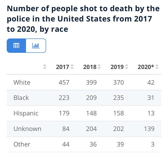 据有关机构统计数据显示,近年来美国警察执法过程中枪击致人死亡事件呈上升趋势。2017年988人死在警察枪下,2018年这一人数是996人,2019年上升至1004人,而到今年,截至3月30日,共有228人被警射杀。