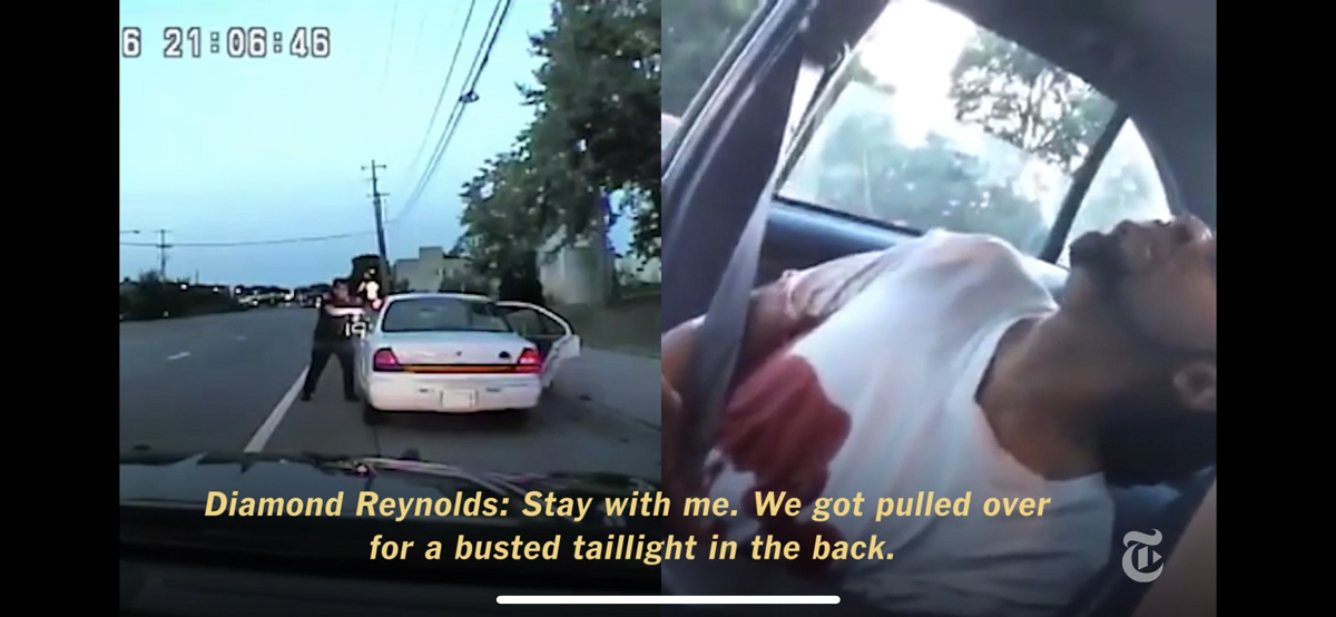 7月6日,一名警察在盘问涉嫌违反交规的32岁男子费兰多·卡斯蒂尔时,连开四五枪击毙对方。卡斯蒂尔的女朋友戴蒙德·雷诺兹在现场亲眼目睹惨剧发生并拍下视频上传互联网,震惊全美。