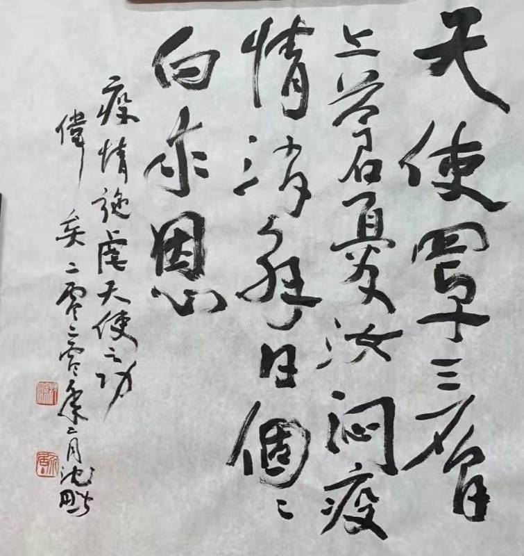 第三、四句“疫情消解日,个个白求恩”,写的自然、轻松、含蓄。自然,避免了装腔作势;轻松,使人在不知不觉中领略艺术之美;含蓄,避免了干瘪无力的宣讲。初看去,诗篇结构单纯,细品炼字写情却是讲究的。诗人借助大家耳熟能详的国际主义战士“白求恩”之名讴歌医护人员,尤其又在“白求恩”名字之前使用“个个”叠字,进一步增强了艺术的感染力,不由使人联想到毛泽东对白求恩那段经典赞誉:“一个高尚的人,一个纯粹的人,一个有道德的人,一个脱离了低级趣味的人,一个有益于人民的人。”