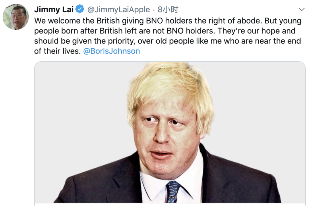 尽管英国政府仍含糊不清,但有些人却已迫不及待了。“乱港四人帮”之首、香港壹传媒创办人黎智英在推特发文表示“欢迎”,他还建议英国政府最好把机会给没有BNO护照的年轻人。