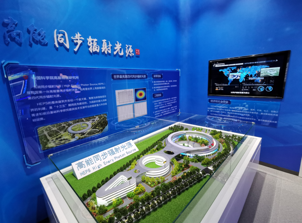 “面向世界科技前沿”包括宇宙的起源、地球的演化、物质的微观结构等部分。展示了500米口径球面射电望远镜“天眼”的模型、落户怀柔科学城的大科学装置高能同步辐射光源模型等。
