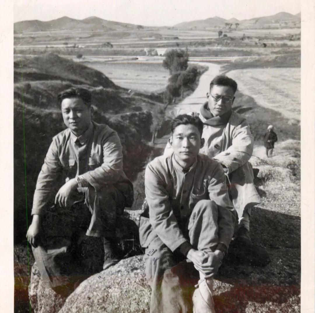 ▍晏明与沙鸥(中)、漫画家方成(右)在长城望京石上合影。(1951年)